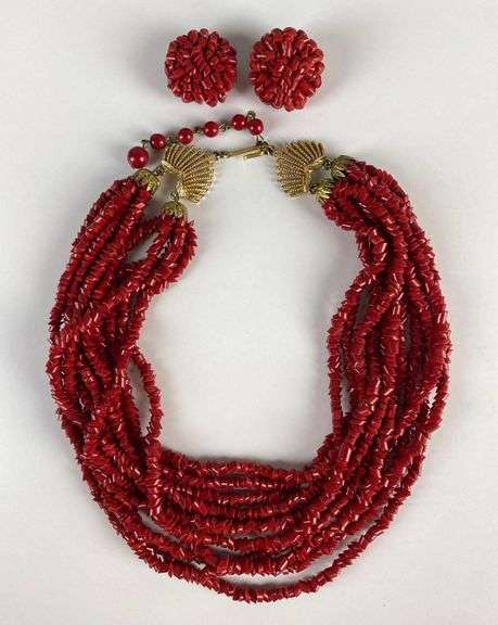 Includes layered necklace, and clip-on earrings, One earring missing backing, Necklace measures 11 inches long.