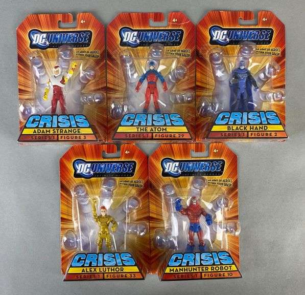 Includes the atom, man hunter robot, Alex Luther and more, like new in boxes, each measures 8 1/2 x 5 x 2 inches