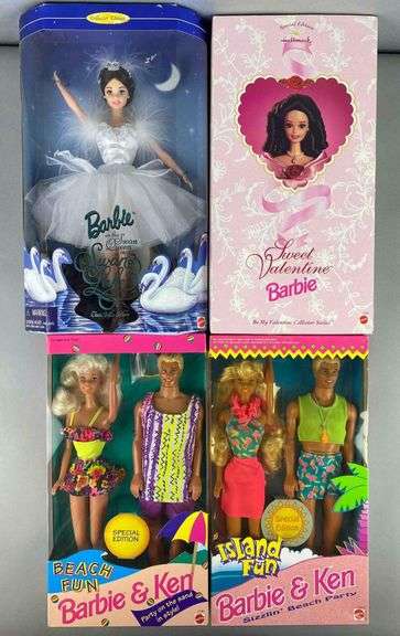 Two boxes feature Ken. Includes Barbies as Swan Queen, Sweet Valentine Barbie, Island Fun Barbie and Ken and more. Largest box measures 13 1/2 x 8 x 3 inches.