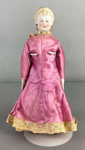 11 inches tall, Porcelain head and limbs, Cloth body, Pierced ears, Blonde curled hair, Blue eyes, Lace undergarments, Unmarked, Doll stand not included.