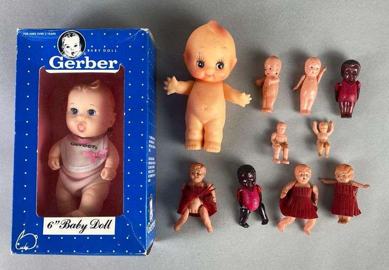 Includes Gerber Baby, Kewpie doll, celluloid babies, and more, Some broken pieces, Box measures 8 1/2 x 5 x 2 1/2 inches.
