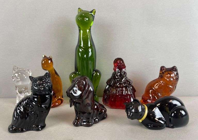 Includes Avon dog and cat perfume bottles with liquid , princess house crystal cat, Viking amber glass car, tallest measures 8 1/2 inches