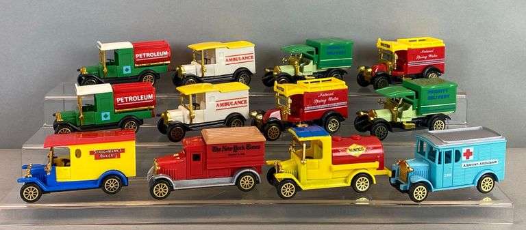 features Early 1900s Models, includes New York Times, Sunoco Gas Oils tanker, Ambulance and more, in original boxes, largest measures 4 inches in length