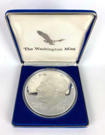 1993 Washington Mint Roosevelt Dime 1/2 Lb. 999 Silver Round. Box measures 1 x 4 3/4 x 4 3/4 inches.