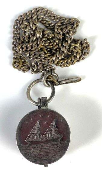 Hallmarks on back and top loop, Chain not sterling, Compass measures 1 x 1 1/2 x 1/2 inches.