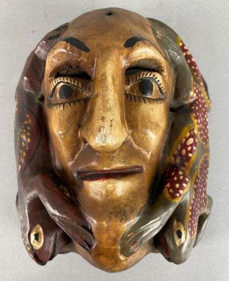 Hand painted carved wood, measures 8 1/2 x 7 1/2 x 4 inches