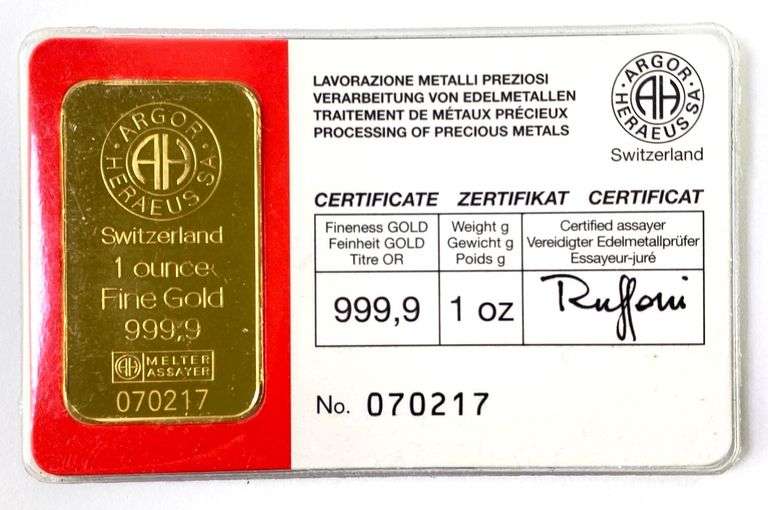 LOT 291 - Argor Heraeus SA 1 oz .9999 Fine Gold Ingot/ Bar