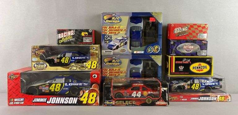 Includes Front Runner R/C Garage Stock Car Kit, winners Circle Jimmie Johnson 1/18 scale model, Revell Tony Stewart 1/24 scale model and more. Largest box measures 5 x 11 3/4 x 7 inches.
