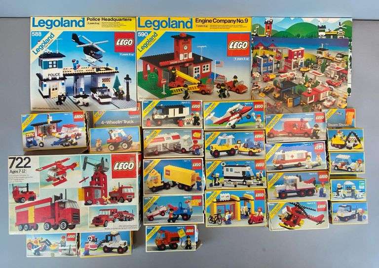 Includes police headquarters, Towtruck, police van, fire copter 1 and more, Boxes contain a loose assortment of mixed pieces. Sets are not separated or bagged, and completeness is unknown, largest box measures 15 x 9 x 3 inches