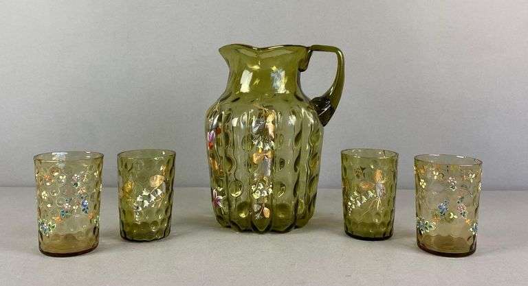 Floral handpainted motif, one glass has large repair crack, pitcher measudes 8 3/4” H x 6 1/2” W x 5 1/2” D