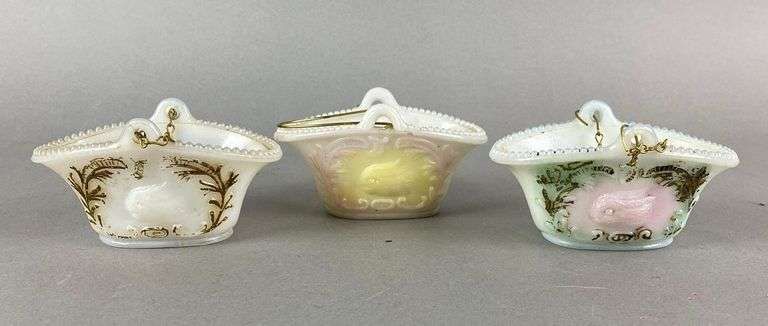 Depicts bunnies and chickens. Chain is unattached on one side. Gold gilt is worn. One has a crack near chain. Largest measures 2 1/2 x 4 1/4 x 2 1/2 inches.