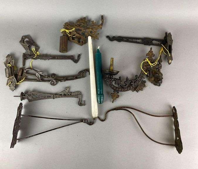 Includes candlesticks and cast iron Oil Lamp Wall Sconce. Largest item measures 6 x 2 1/4 x 10 inches.