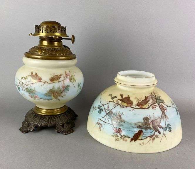Does not include tripod or chimney. Top of the lamp shade is chipped. Base measures 11 1/4 x 9 x 9 inches.