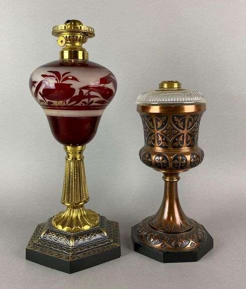 Gold gilt is worn on cranberry glass. One is a heavy brass. Largest measures 15 x 7 1/2 x 7 1/2 inches.
