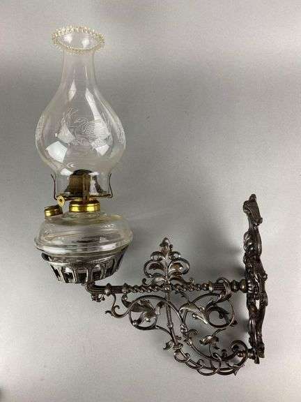 Chimney has two small chips on lower edge. Oil lamp measures 12 3/4 x 6 x 6 inches. Sconce measures 11 x 5 x 12 1/2 inches.