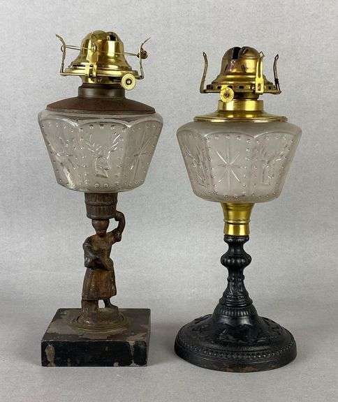 Includes 1 Figural woman, and 1 leaf and vine patterning, Both with clear embossed frosted glass founts, Tallest measures 12 1/2 x 4 3/4 x 4 3/4 inches.