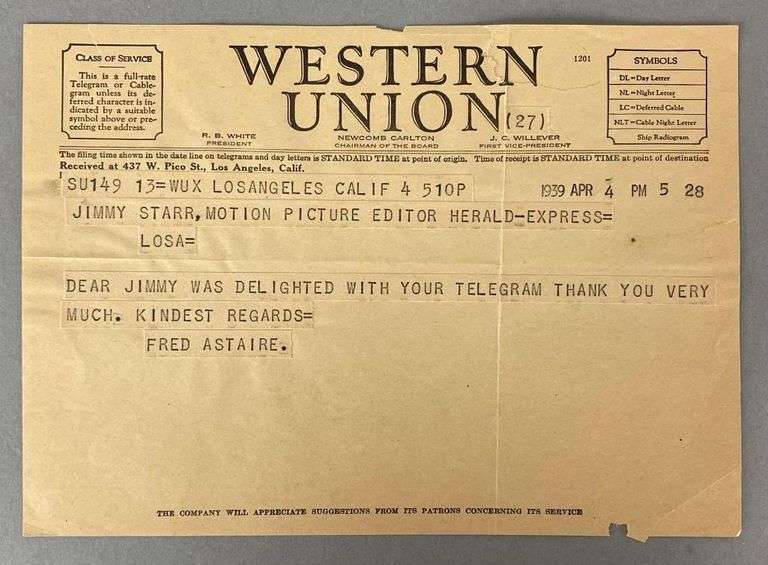 Western Union, In response to telegram sent to him, small tear across top, Measures 5 3/4 x 8 inches.