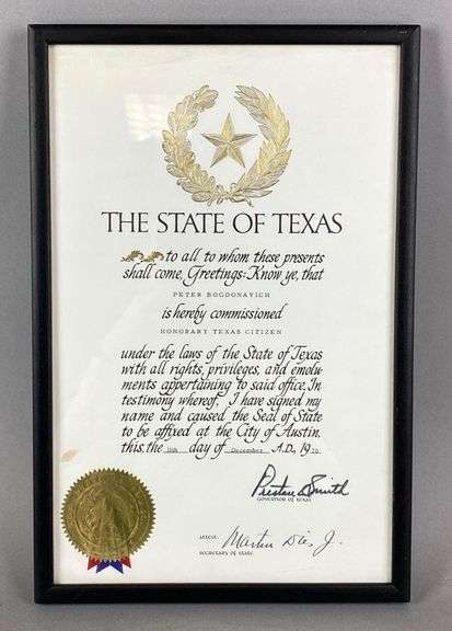 LOT 780 - 1970 Official Texas Citizen Peter Bogdanovich Award