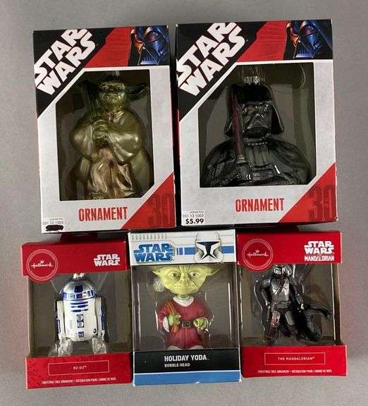 Includes Holiday Yoda, The Mandalorian, R2-D2 and more, like new in packaging, largest measures 6 1/2” H x 5” W x 4” D