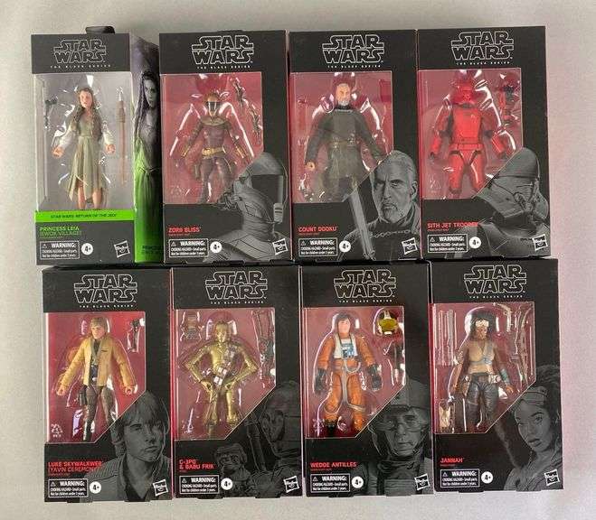 Includes Sith Jet Trooper, Count Dooku, Ewok Cillage Princess Leia and more, sealed, largest boxes measure 9” H x 5” W x 2” D