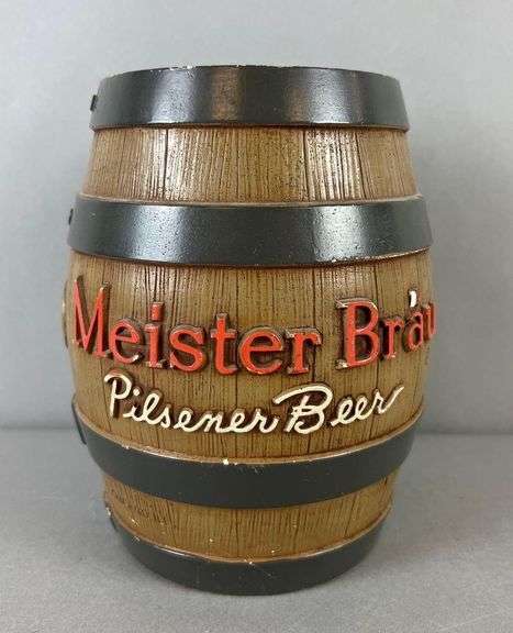 LOT 368 - Vintage Small Meister Brau Advertising Chalk Beer Barrel Coin Bank