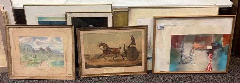 Includes prints, oil paintings, and more. Largest measures 37" x 30". Flaking, water damage, broken glass throughout. NO SHIPPING