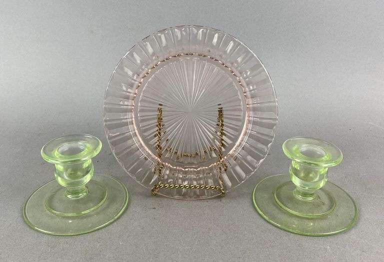 Includes 2 uranium glass candlestick holder that Are UV light reactive. And an anchor hocking Open Rose plate. Largest item measures H3/4 x W6 3/4 x D 6 3/4 inches.