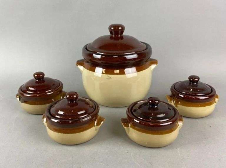 Includes 4 Soup bowls with lids. Largest item measures H8 1/2 x W9 x D8 1/2 inches