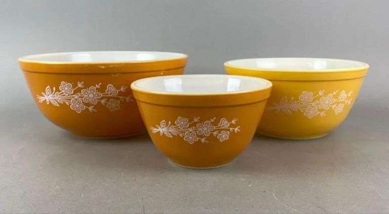 Butterfly Gold Pattern. Includes 750 Ml, 1.5 L and 2.5 L bowls. Largest measures H 4 x W 8 3/4 x D 8 3/4 inches